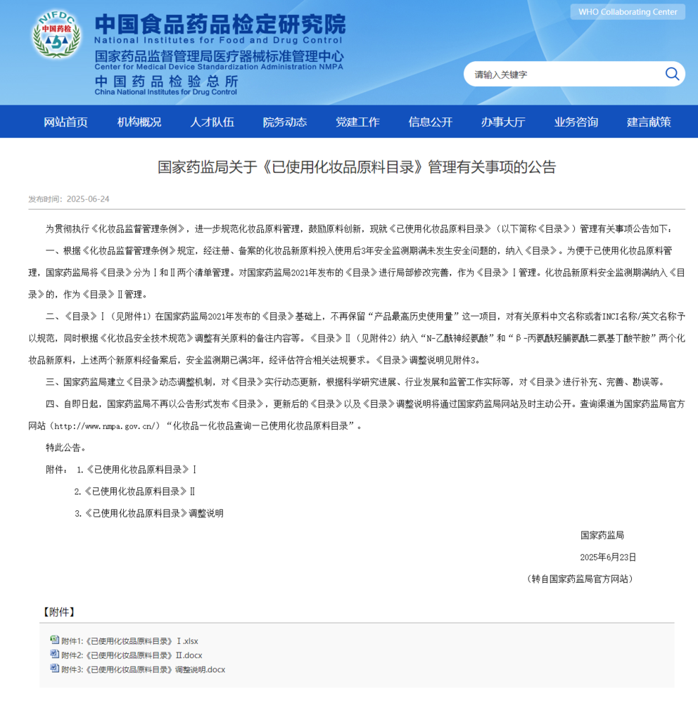 四、自即日起,國家藥監(jiān)局不再以公告形式發(fā)布《目錄》,更新后的《目錄》以及《目錄》調(diào)整說明將通過國家藥監(jiān)局網(wǎng)站及時主動公開。查詢渠道為國家藥監(jiān)局官方網(wǎng)站(http://www.nmpa.gov.cn/)“化妝品—化妝品查詢—已使用化妝品原料目錄”。